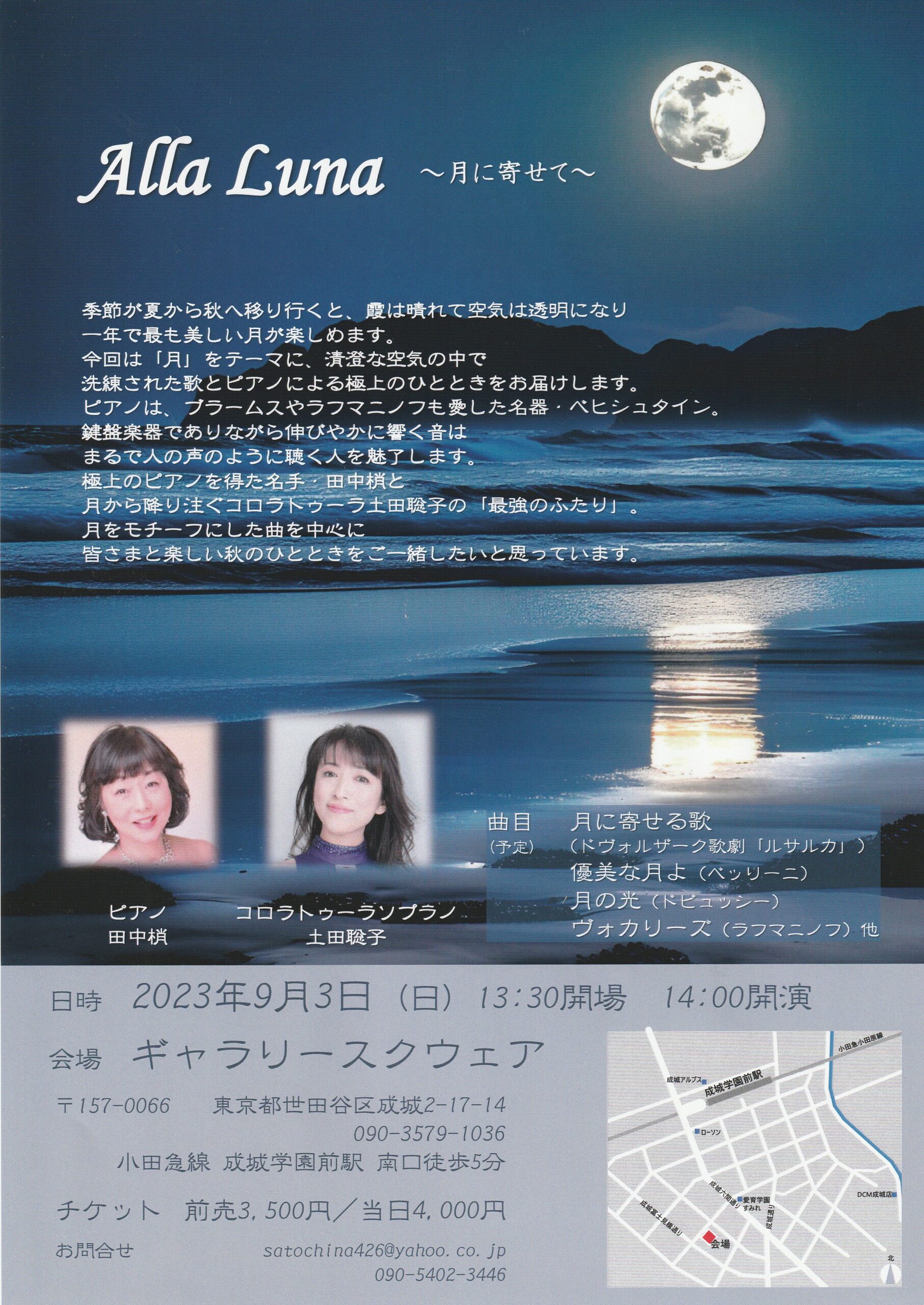 コロラトゥーラソプラノ土田聡子とピアニスト田中梢のデュオで、「月」をモチーフにした曲をお届けします。